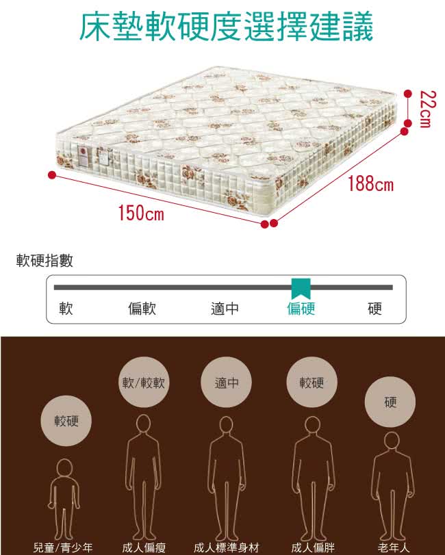 高密度釋壓棉+621顆精鋼彈簧+涼感節能纖維+備長碳律動棉+奈米海綿等材質