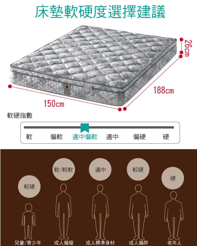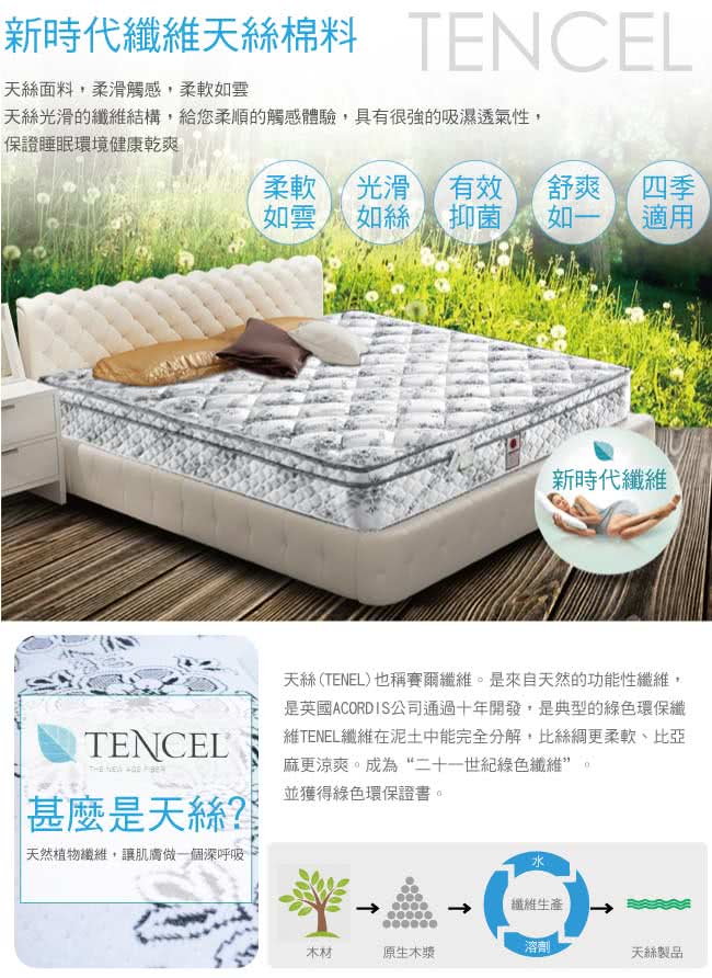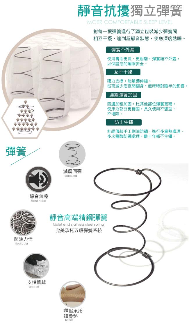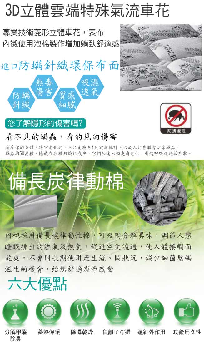 抗菌防蹣布面+621顆精鋼彈簧+天絲纖維棉料+備長碳律動棉+奈米海綿等材質